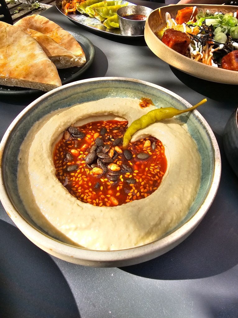 - Hummus: This was an excellent dish—smooth and light, with a wonderful crunch from the pine nuts and a kick from the chili oil. However, it was odd that the bread didn’t come with the hummus and had to be ordered separately for an additional cost.